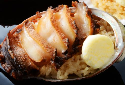 蝦夷あわびを贅沢に盛り付けた炊き込みご飯です