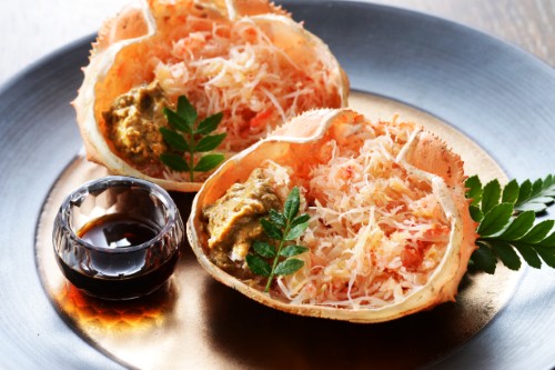 オオズワイ蟹のむき身をたっぷり甲羅に盛り付けました。蟹みそ入りです。